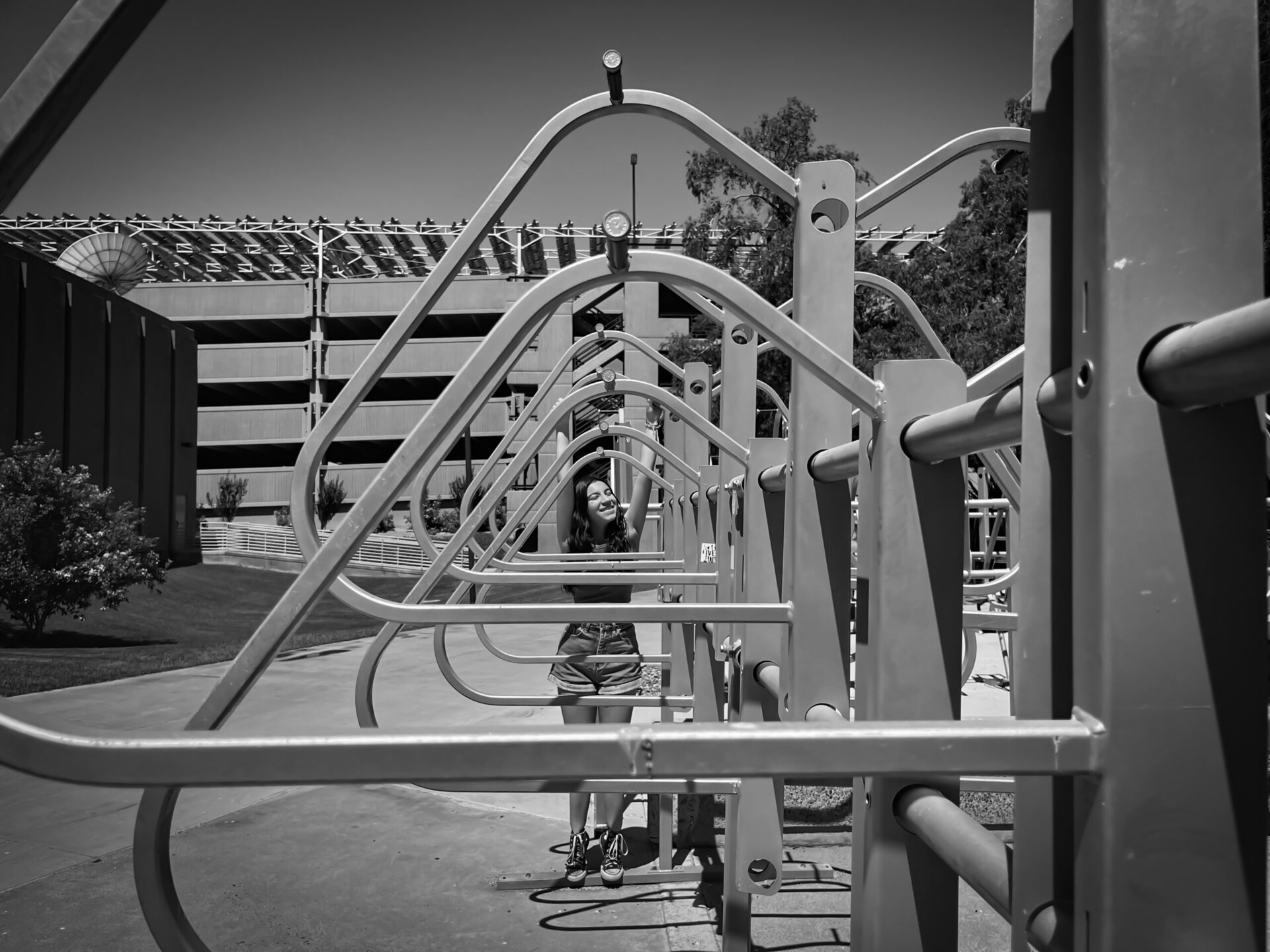This photo of my friend was taken on the Arizona State University campus. Bike and skateboard racks are commonly found throughout the school’s outdoor spaces. When I saw the naturally reducing frame that I knew would lead the eye to the subject, I had to take the picture. I later smoothed and recolored it monochromatic.